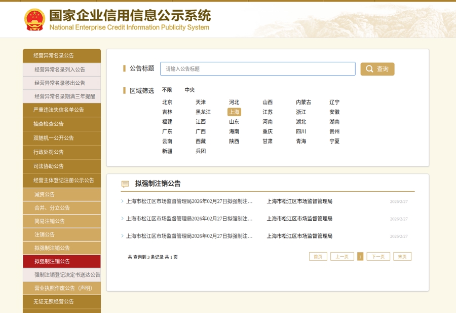 “国度企业信用信息公示网”上,商场监管总局发布松江区企业强制刊出的公告。