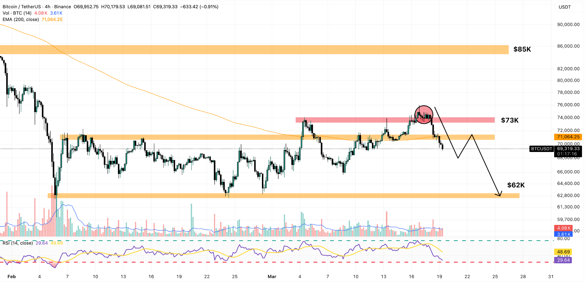 从4小时图来看,此前市集一度觉得,若比特币轻易73000好意思元,有望进一步上探85000好意思元。不外,其时市集也预期,71000好意思元这一前期阻力位在回踩后应能转动为撑握。