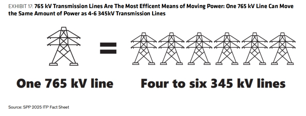 与传统输电线路相比,765千伏线路具有碾压性优势:单条线路可输送2至2.5吉瓦电力,相当于4至6条345千伏线路的输送能力,足以满足纽约市一半的电力需求;单位里程成本比345千伏线路低50%至60%,占地面积减少55%至75%,电力损耗降低50%以上。