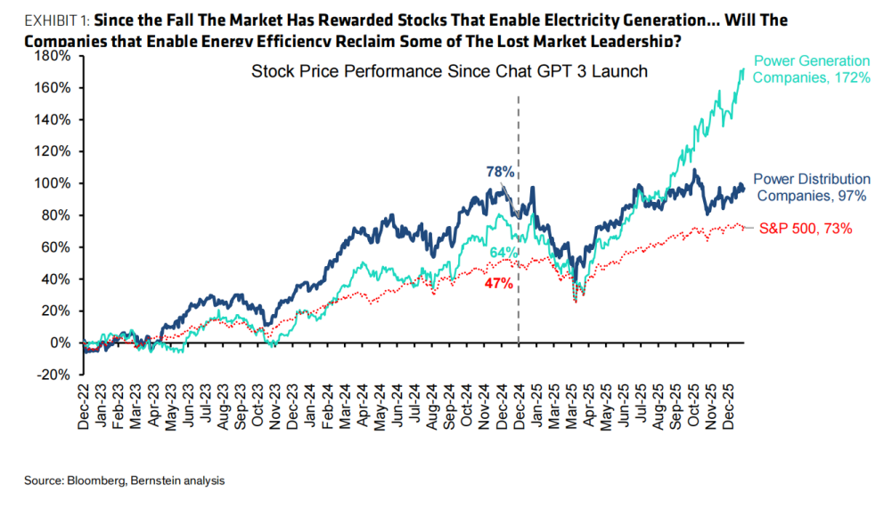伯恩斯坦认为,多数投资者执着于"建更多电厂"的蛮力扩张逻辑,却忽略了破解电力短缺的最优解:在不增加发电容量的前提下,通过技术创新提升电力效率。报告强调,800伏数据中心架构和765千伏输电线路这两项高电压技术,每项都能将电力效率提升高达5%。随着电力周期从"产能扩张"的第一阶段进入"效率提升"的第二阶段,此前被低估的配电及电力管理企业有望收复失地,重塑市场格局。