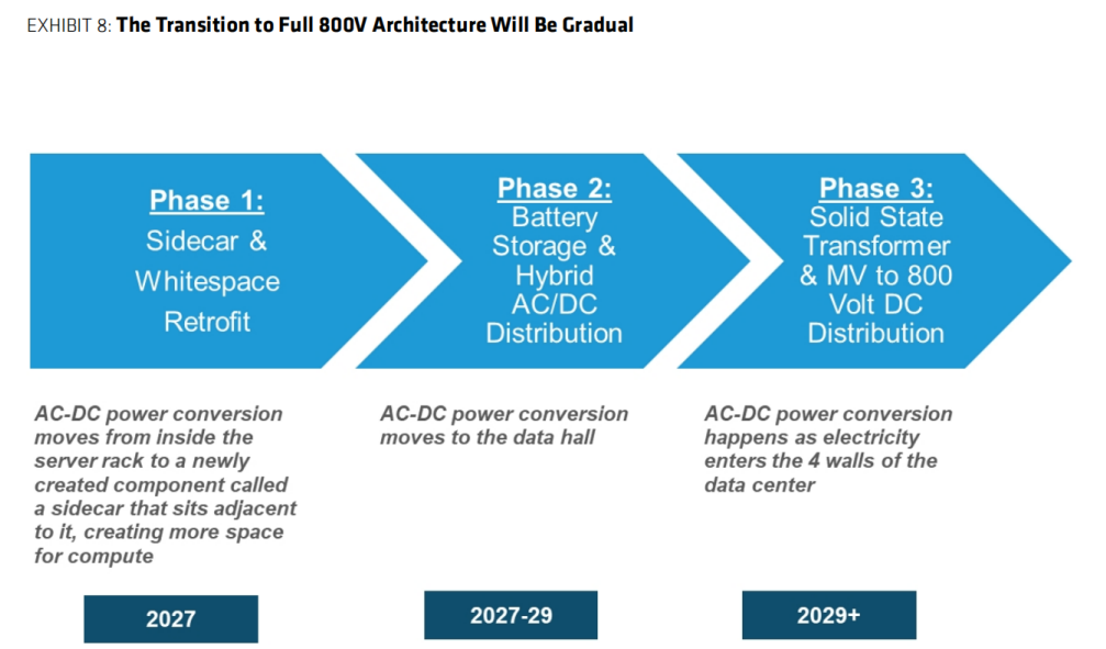 800V直流架构从根本上解决了这些痛点。与54V架构中电力以14千伏交流进入数据中心、经多次降压转换后送达芯片不同,800V架构下,电力以800V直流形式进入数据中心,并在设施内保持该电压,直至送达服务器前才降压至0.8V直流。