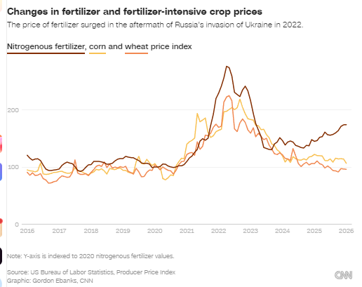 伊朗谗谄正在让本就处境粗重的好意思国农民承受更高资本 —— 在客岁关税压力之上,化肥与动力价钱再度上升。好意思国农业面对的捏续压力,可能进一步推高食物杂货价钱。